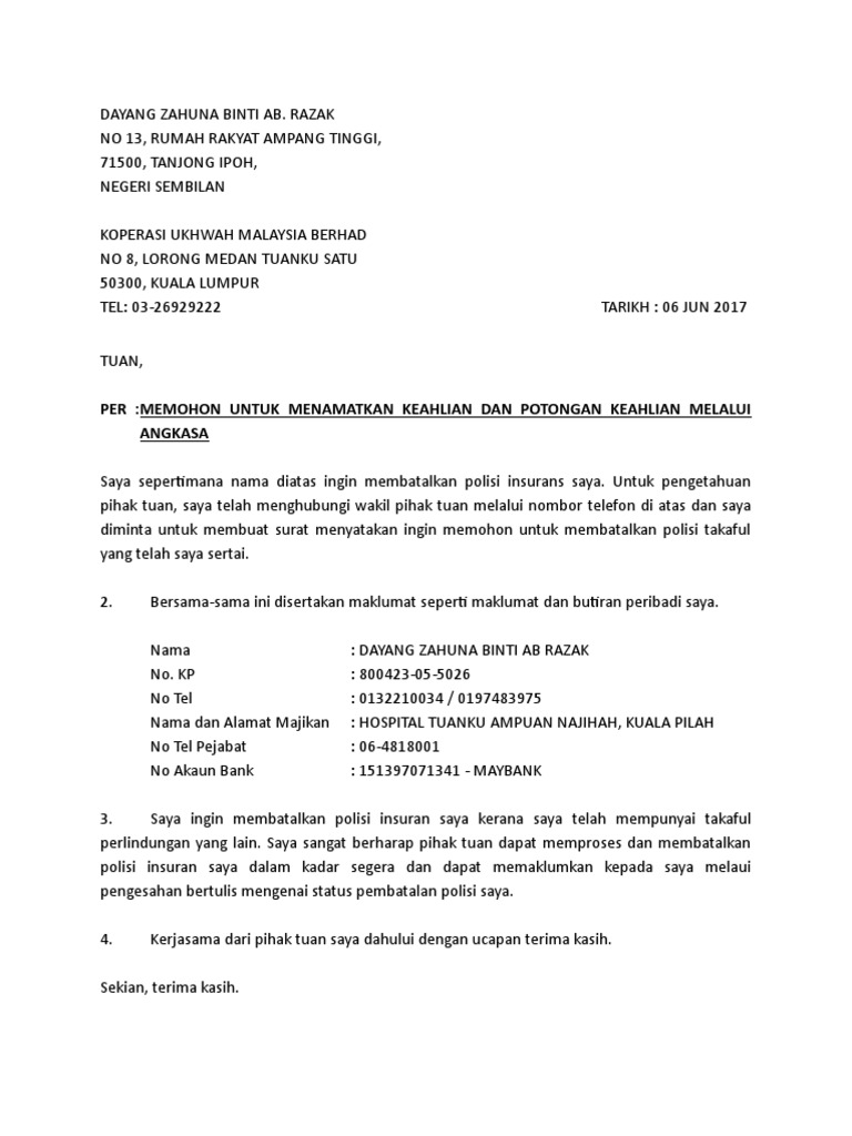Permohonan Membatalkan Polisi Insurans Takaful Pdf